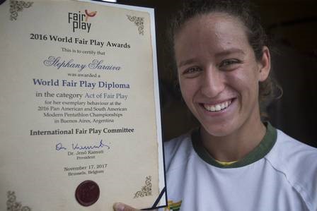 A pentatleta Stephany Saraiva recebeu o Diploma de Ato de Fair Play de 2016 pela sua conduta no Campeonato Pan-Americano de Pentatlo Moderno, disputado um ano antes, na Argentina. Durante a prova de esgrima o sensor, que acusa quando a espada encosta na atleta, acendeu a favor da brasileira.