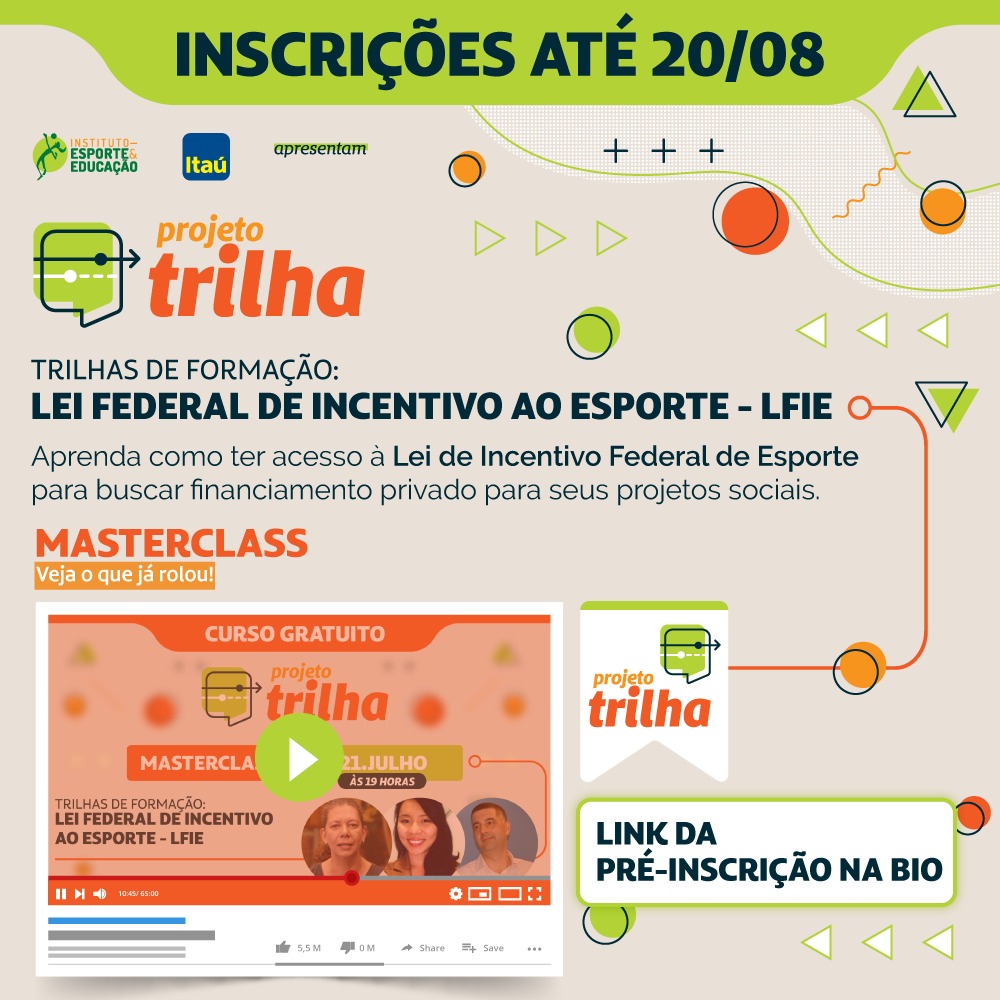 Quem busca informações sobre como ter acesso à Lei Federal de Incentivo ao Esporte (LFIE) tem uma última chance para se inscrever no “Trilhas de Formação: Lei Federal de Incentivo ao Esporte – LFIE”. O curso, lançado pelo Projeto Trilha, apresentado pelo Instituto Esporte & Educação (IEE) e pelo Itaú Unibanco, teve suas inscrições prorrogadas e, agora, podem ser feitas até esta sexta-feira (20) pelo link: https://principios.esporteeducacao.com/trilha/ . Com três módulos de conteúdos exclusivos e mais de 60 horas, na plataforma EAD, é totalmente on-line e gratuito.