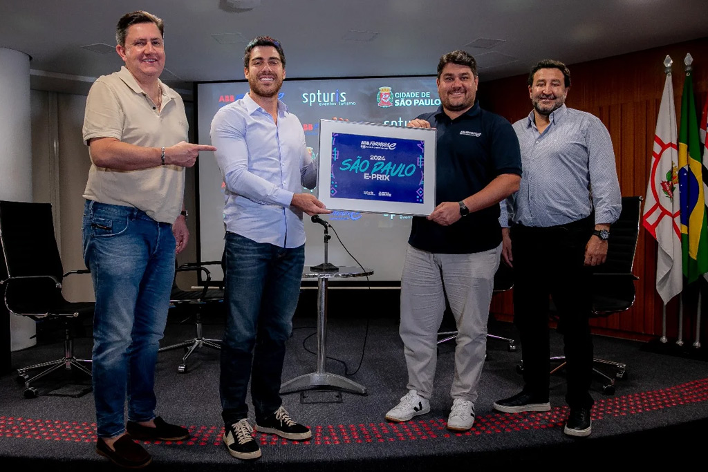 Guilherme Birello, diretor da Fórmula E local, e Gustavo Pires, presidente da SPTuris, falaram dos desafios de receber pela segunda vez a categoria dos carros elétricos. Alex Peixe, chefe de gabinete da SPTuris, e Sandro Cuoghi, diretor de negócios SPTuris, também estiveram no local.