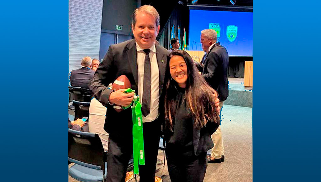 Na foto: Cris Kajiwara (Confederação Brasileira de Futebol Americano) e Marcos Laporta (Presidente do COB).